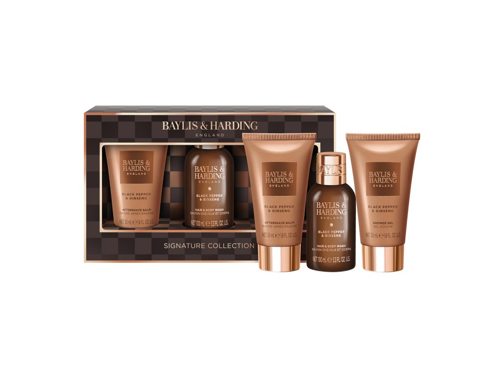 Black Pepper & Ginseng - sada s péčí o tělo, vlasy a pleť, 3 ks pánská dárková sada tělové, pleťové a vlasové péče s kořeněnou vůní