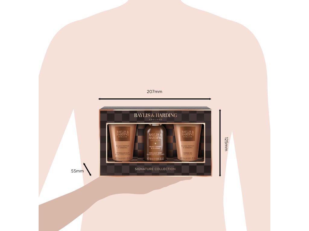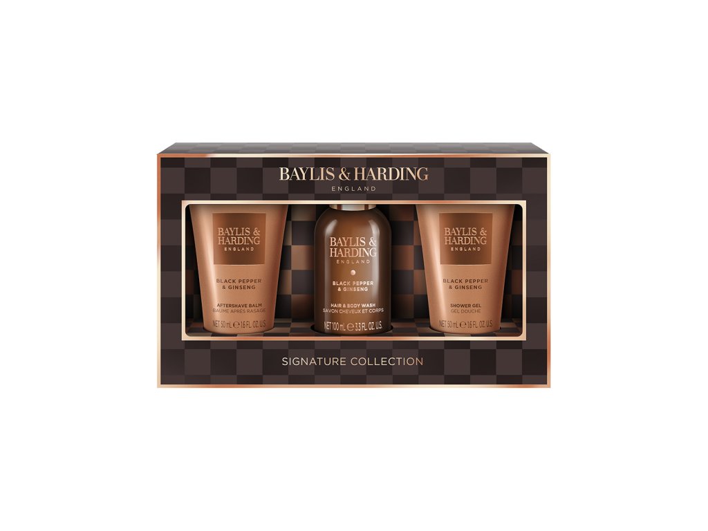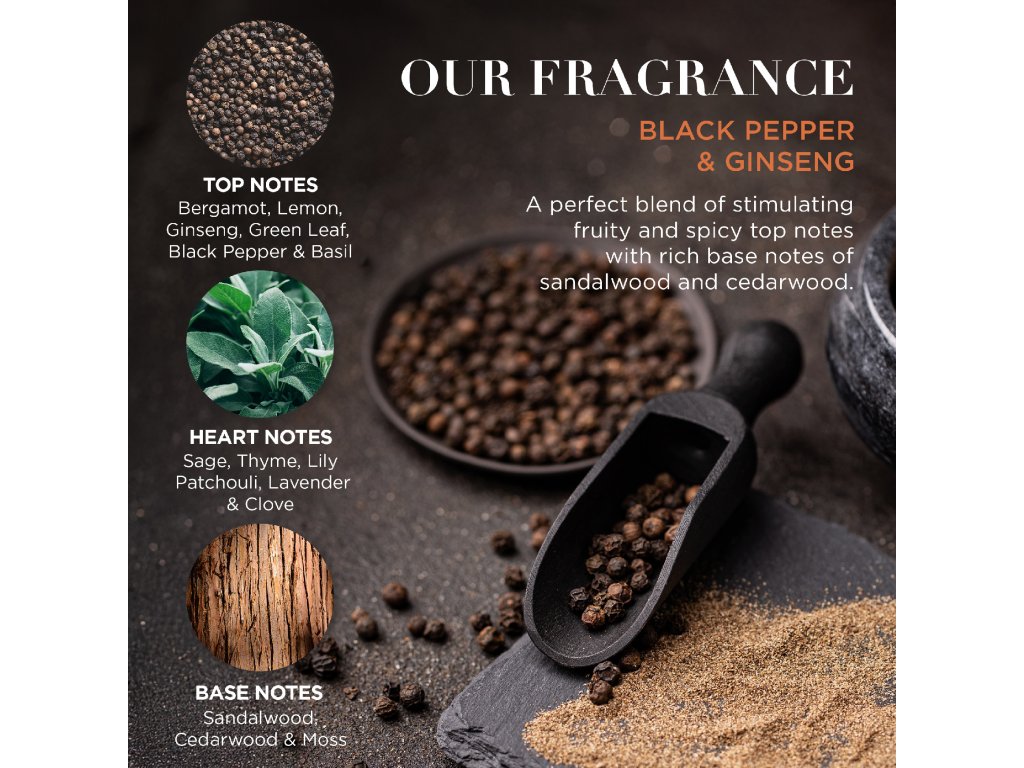 Nadčasová a sofistikovaná pánská kolekce Black Pepper & Ginseng propůjčila svému designu moderní, dynamický vzhled s ikonickou šachovnicovou grafikou a elegantními bronzovo-zlatými detaily. Společně s ovocno-kořeněnými tóny černého pepře, ženšenu, cedrového a santalového dřeva vytváří elegantní kolekci produktů péče o tělo pro všechny gentlemany.