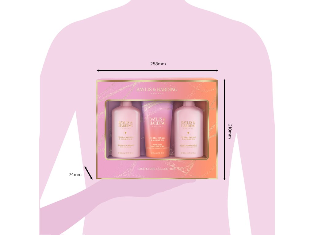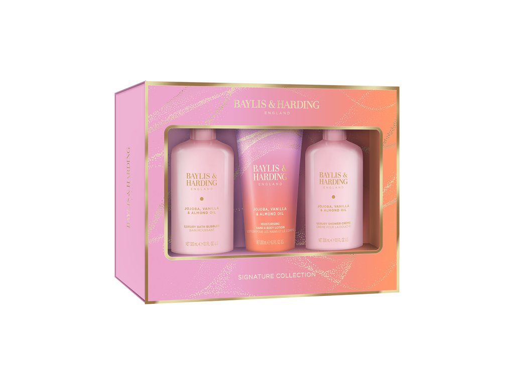 Luxusní kolekce Jojoba, Vanilla & Almond Oil je prezentována metalickými, ombré odstíny pastelově růžové a broskvové barvy s explozí třpytivých detailů, které společně s holografickým balícím papírem propůjčují kolekci ojedinělý vzhled inspirující se krásou poznání astrologie. Kolekci provází jemná a smyslná vůně vanilky, mandlového oleje a sladké jojoby.
