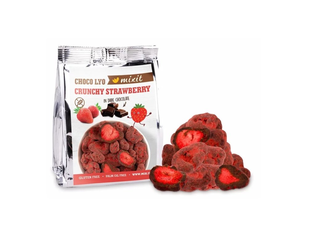 Jahůdky z jedné a druhé kapsy. Jsou obalené v čokoládě a lahodné tak, že by to nevymyslel ani Čapek. :-) Křupavou jahůdku jsme usušili mrazem a pak ji obalili v lahodné hořké čokoládě, kterou jsme poprášili jahodovým prachem. Je plná vitamínů, bez umělých barviv a hlavně – chutná prostě božsky. Kam se s touto křupavou svačinou vydáte? Dobrodružství čeká! :-)