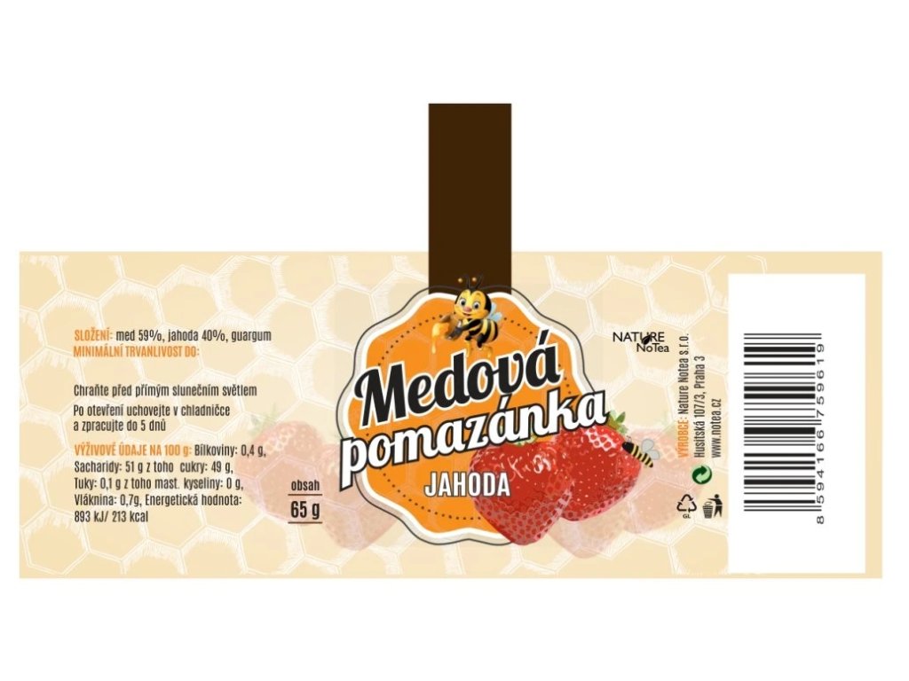Med 59%, jahoda 40%, guarová guma (přírodní zahušťovadlo - zajišťuje, aby pomazánka zůstala jemná a dobře roztíratelná).