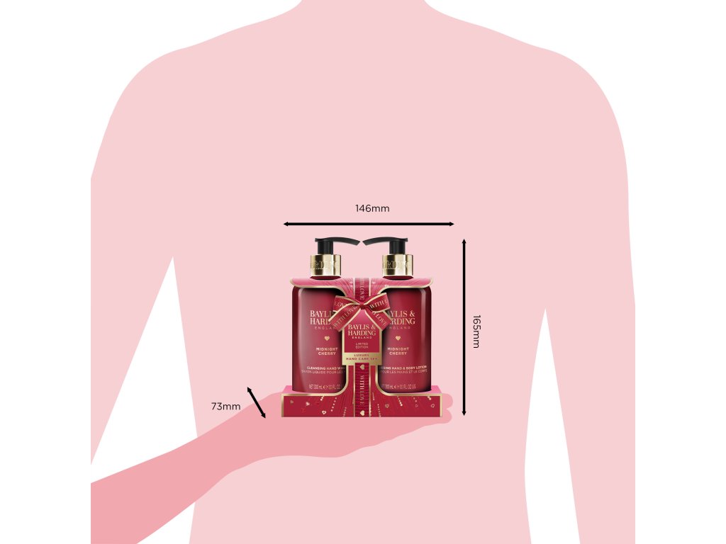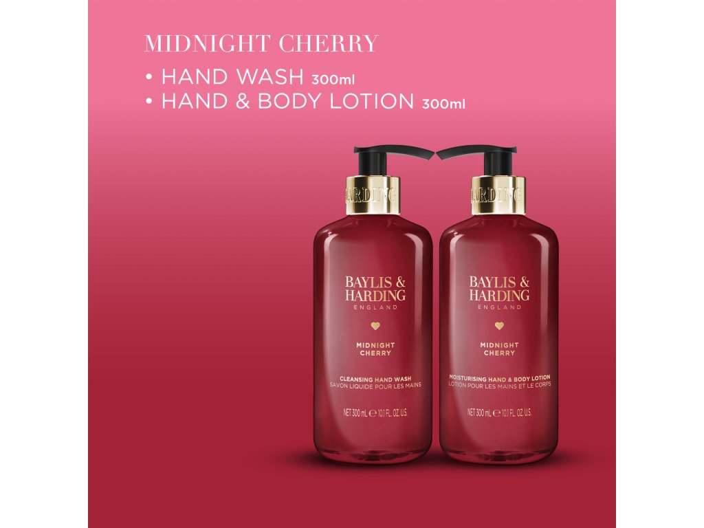 Tato stylová sada péče o ruce je zkrátka královnou každé koupelny. S praktickými pumpičkami se perfektně hodí na umyvadlo, vanu nebo do sprchového koutu. Tekuté mýdlo jemně čistí pokožku rukou, zanechává ji hebkou a nádherně provoněnou. Vyživující tělové mléko dodává pokožce potřebnou hydrataci a úlevu od pocitu suchosti. Zanechá ji hebkou, vláčnou a příjemně provoněnou vůní skladkokyselých třešní, mandlí a likéru. Dopřejte si smyslný pečující rituál s Baylis & Harding!