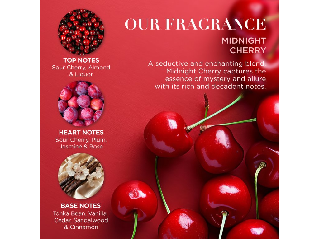 Kolekce Midnight Cherry s vůní sladkokyselé třešně, jemných mandlí a kapky likéru v sobě spojuje sváteční atmosféru a hřejivé kouzlo zimních večerů. Výrazný design v tónech rudé a růžové se zlatými detaily dodává každému produktu slavnostní nádech – ideální pro chvíle rozmazlování nebo jako luxusní dárek pod stromeček.
