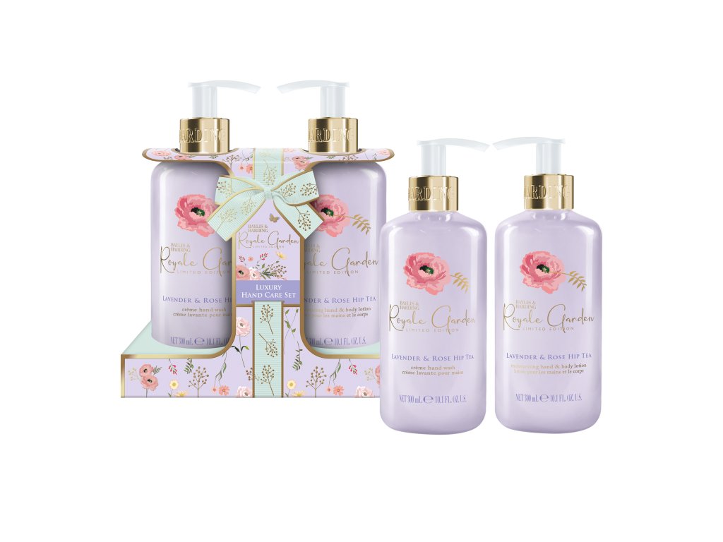 Tato stylová sada péče o ruce je zkrátka královnou každé koupelny. S praktickými pumpičkami se perfektně hodí na umyvadlo, vanu nebo do sprchového koutu. Tekuté mýdlo jemně čistí pokožku rukou, zanechává ji hebkou a nádherně provoněnou. Vyživující tělové mléko dodává pokožce potřebnou hydrataci a úlevu od pocitu suchosti. Zanechá ji hebkou, vláčnou a příjemně provoněnou jemnou vůní levandule a šípku. Dopřejte si smyslný pečující rituál s Baylis & Harding!