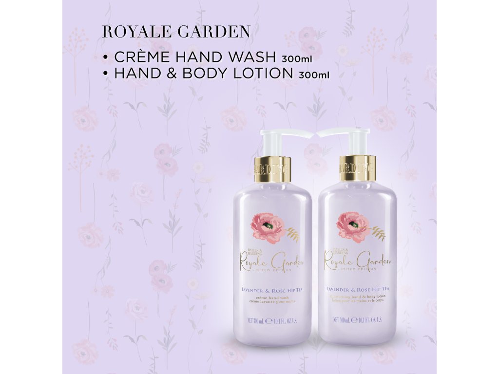 Royale Garden představuje romantickou kolekci inspirovanou tradiční anglickou zahradou. Spojuje květinové motivy s pastelovými tóny fialové a mátové, doplněné zlatými detaily. Květinový design a jemná vůně levandule a šípku vytvářejí něžnou kolekci pečujících produktů pro každou ženu.