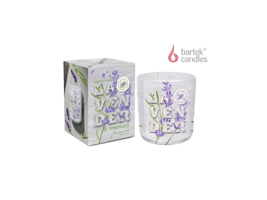 Svíčka ve skle 150g s vůní a dekorem levandule a rozmarýn, rozměr svíčky: průměr 8 x 8,5cm, rozměr boxu: 8 x 8 x 11cm, doba hoření jedné svíčky: 35 hodin,
