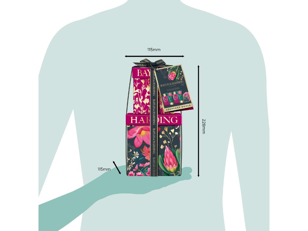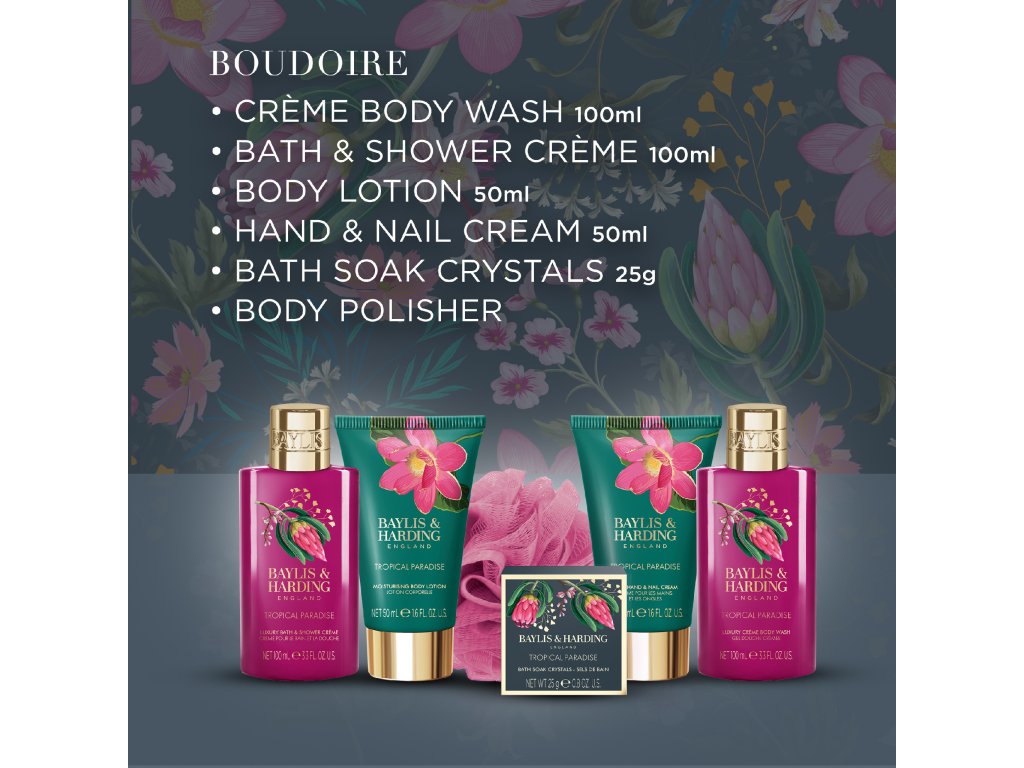 Trendy kolekce Boudoire - Tropical Paradise přináší exotický květinový design s moderním nádechem a špetkou luxusu. Odvážná paleta fuchsiové růžové a smaragdově zelené je doplněna zlatými detaily, které celé řadě dodávají výjimečný charakter. Pečující produkty a nádherné dárkové sady doprovází tropická vůně banánu, broskve a pomerančového květu.