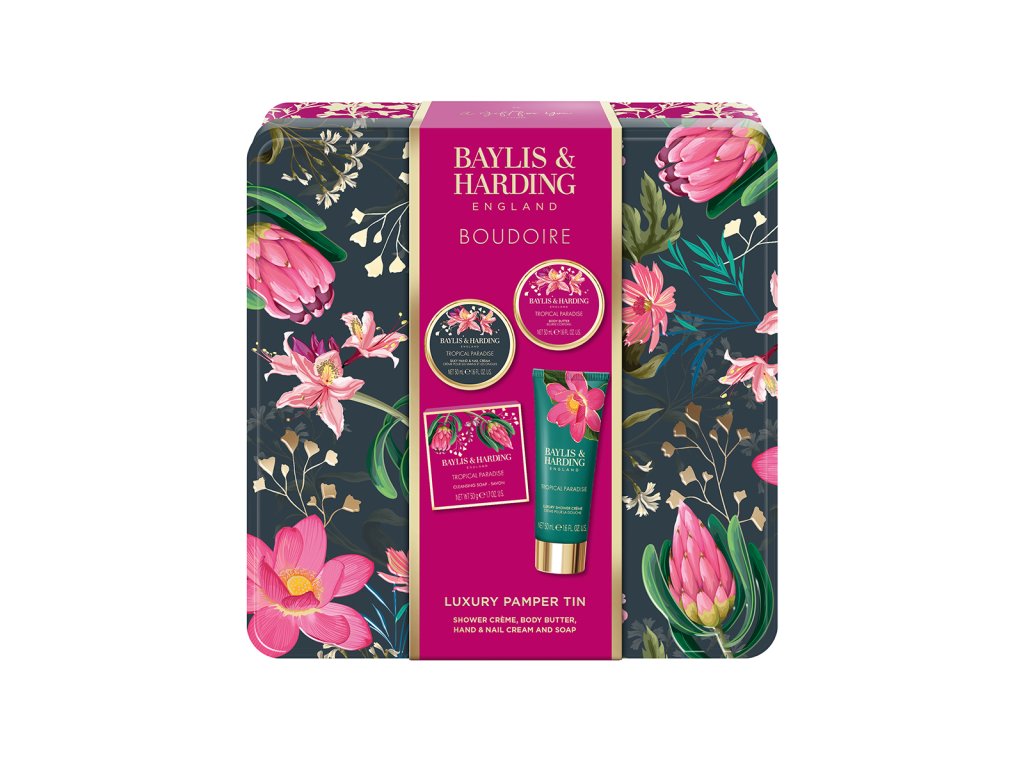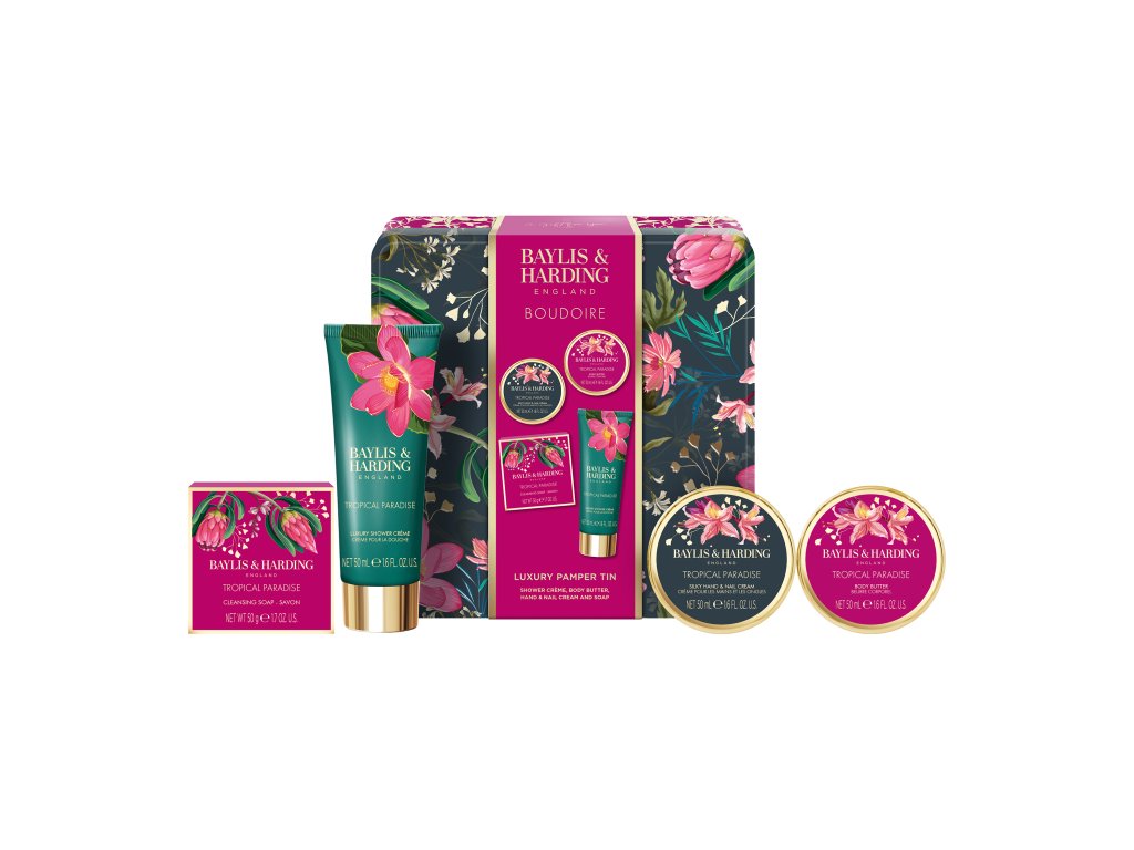 Tropical Paradise - sada s péčí o tělo a ruce, 4 ks luxusní dárková pečující sada tělových produktů v plechové dóze