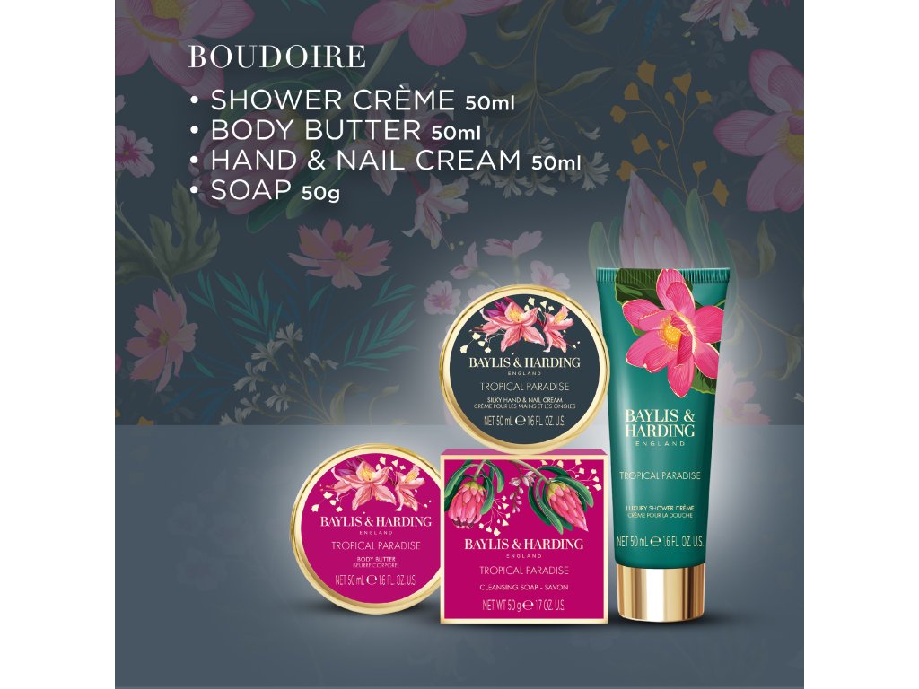 Trendy kolekce Boudoire - Tropical Paradise přináší exotický květinový design s moderním nádechem a špetkou luxusu. Odvážná paleta fuchsiové růžové a smaragdově zelené je doplněna zlatými detaily, které celé řadě dodávají výjimečný charakter. Pečující produkty a nádherné dárkové sady doprovází tropická vůně banánu, broskve a pomerančového květu.