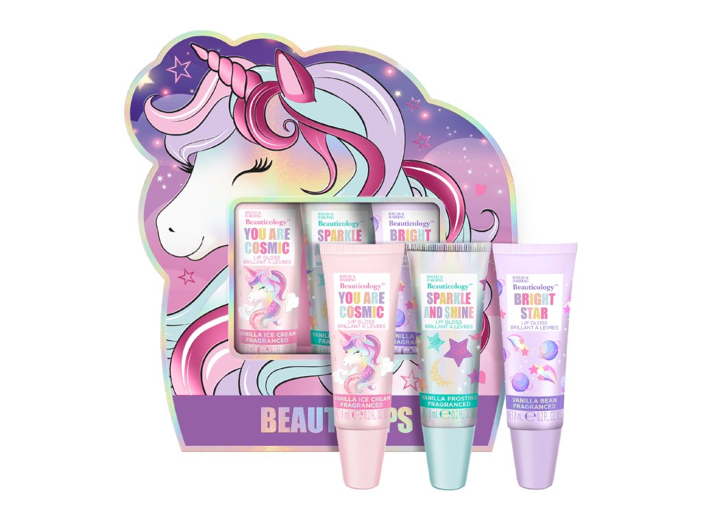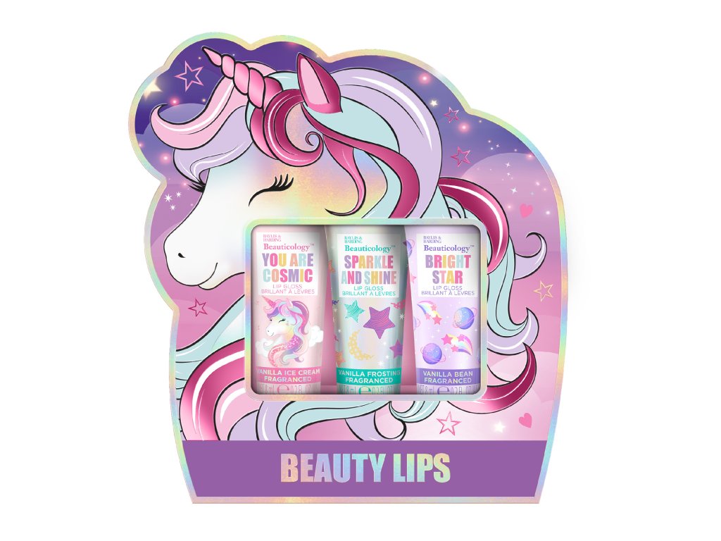 Unicorn - sada lesků na rty, 3 ks dětská sada lesků na rty s vanilkovou příchutí a třpytivým efektem