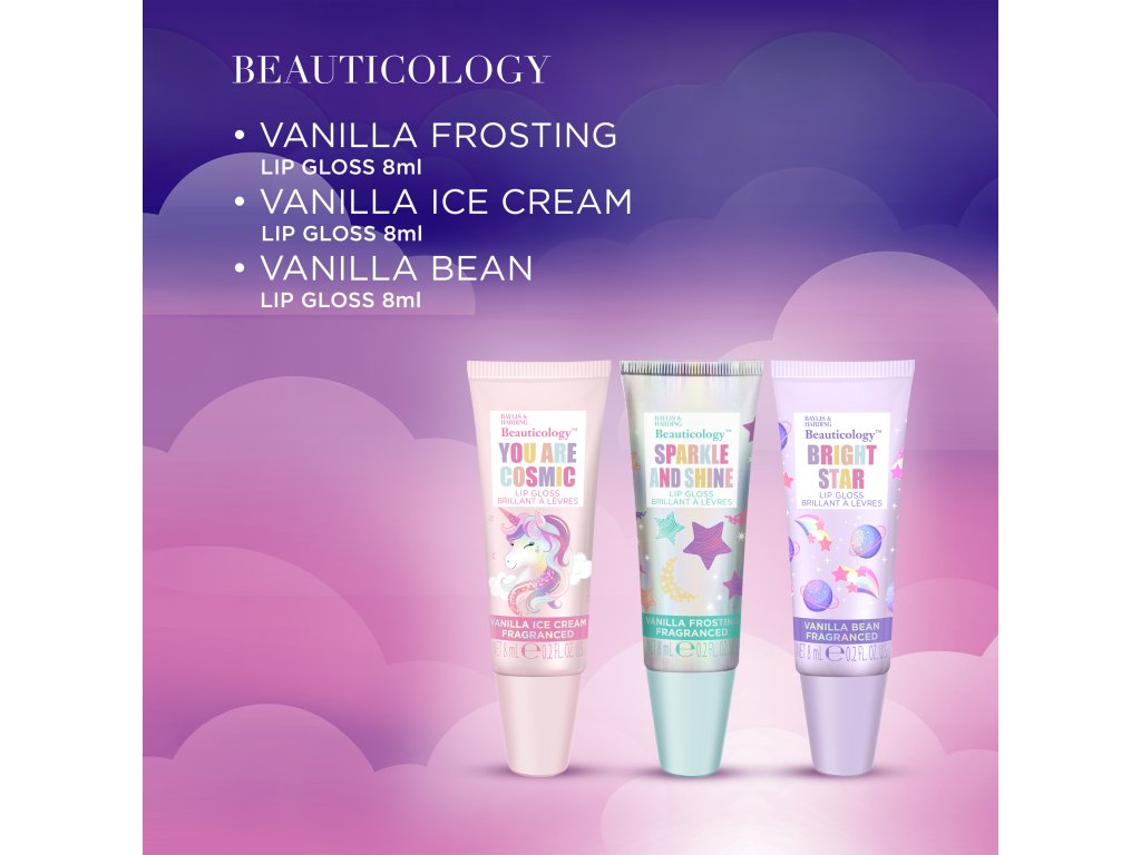 Kolekce Beauticology je hravá, zábavná, kouzelná a barevná. Design s holografickými detaily, veselými barvami a galaktickými motivy tvoří společně s rozmanitými vůněmi cukrovinek perfektní kolekci pro malé či větší milovníky jednorožců!